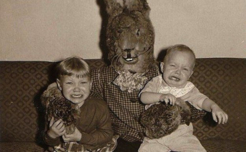 A buzzfeed.com összeszedett néhány régi fotót, képeslapot, amiken elvileg vidám nyuszik ölében ülnek vidám gyerekek, a valóságban azonban félelmetes lények félemlítenek meg rettegő gyerekeket.